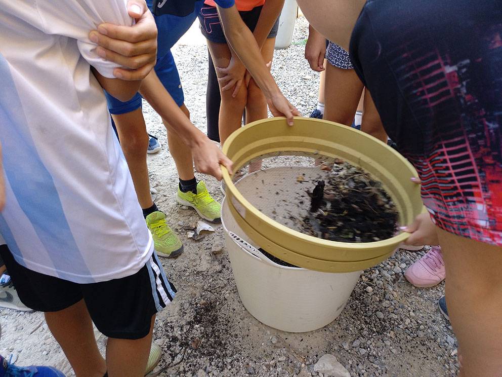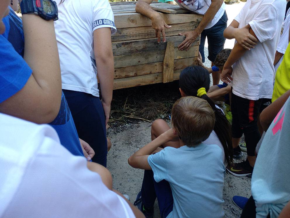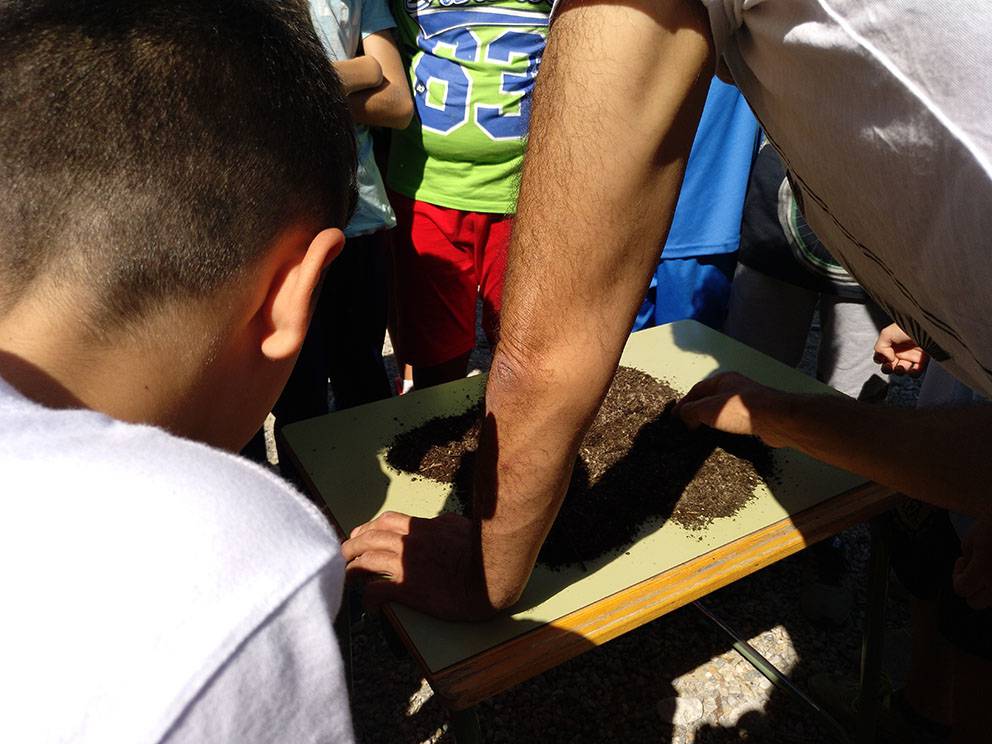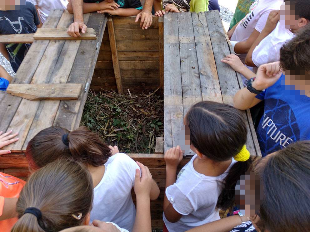 Los alumnos de 6º de primaria han visitado el huerto para hacer una exploración de los habitantes del compost que está generándose en su compostera escolar, y confirmar así que es un sistema vivo. En ella viven organismos de muchos tipos diferentes, algunos visibles a simple vista, y otros a través de lupas o microscopios.