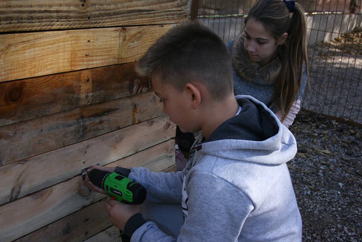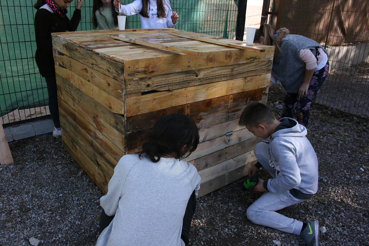 Esta es la segunda actividad más importante del periodo inicial del programa en el centro. En este taller se construye partiendo de materiales reciclados; palés de madera o contenedores desechados, una compostera de aproximadamente 1 m³ para descomponer la materia verde de los residuos de las meriendas de los escolares y restos vegetales de la jardinería de los ajardinados del Centro para obtener compost y nutrir los siguientes ciclos productivos del huerto.
