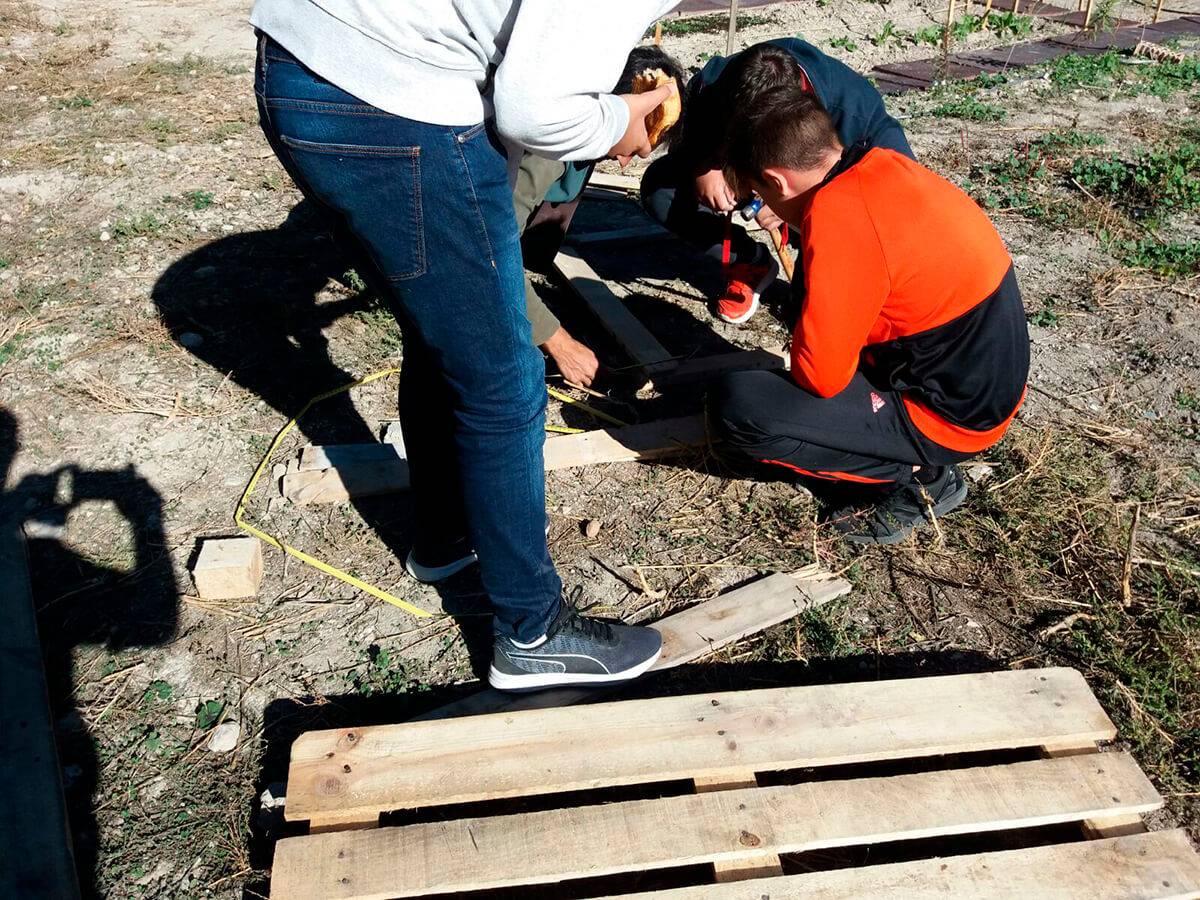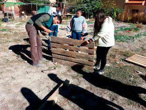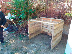 Esta es la segunda actividad más importante del periodo inicial del programa en el centro. En este taller se construye partiendo de materiales reciclados; palés de madera o contenedores desechados, una compostera de aproximadamente 1 m³ para descomponer la materia verde de los residuos de las meriendas de los escolares y restos vegetales de la jardinería de los ajardinados del Centro para obtener compost y nutrir los siguientes ciclos productivos del huerto.