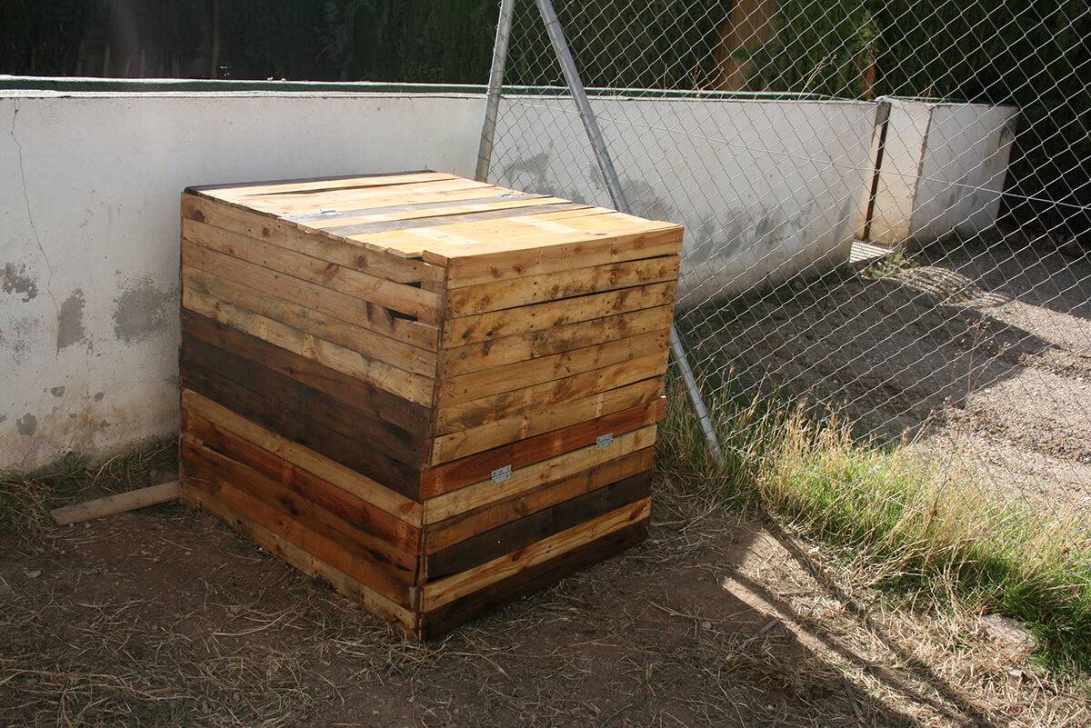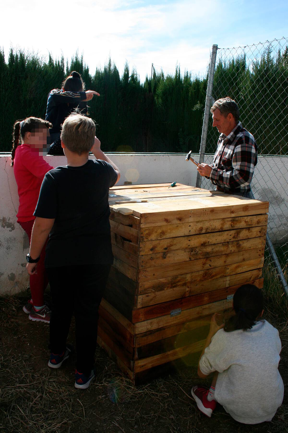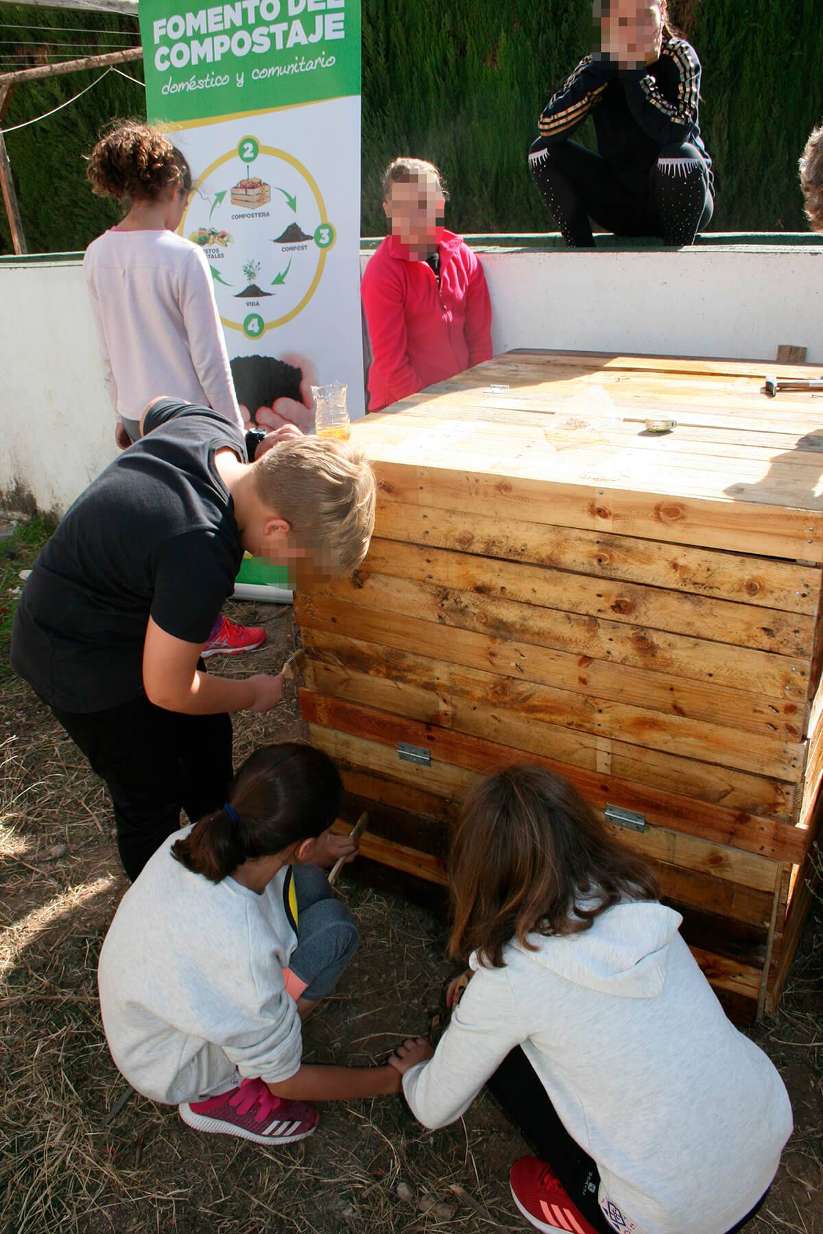 Esta es la segunda actividad más importante del periodo inicial del programa en el centro. En este taller se construye partiendo de materiales reciclados; palés de madera o contenedores desechados, una compostera de aproximadamente 1 m³ para descomponer la materia verde de los residuos de las meriendas de los escolares y restos vegetales de la jardinería de los ajardinados del Centro para obtener compost y nutrir los siguientes ciclos productivos del huerto.