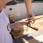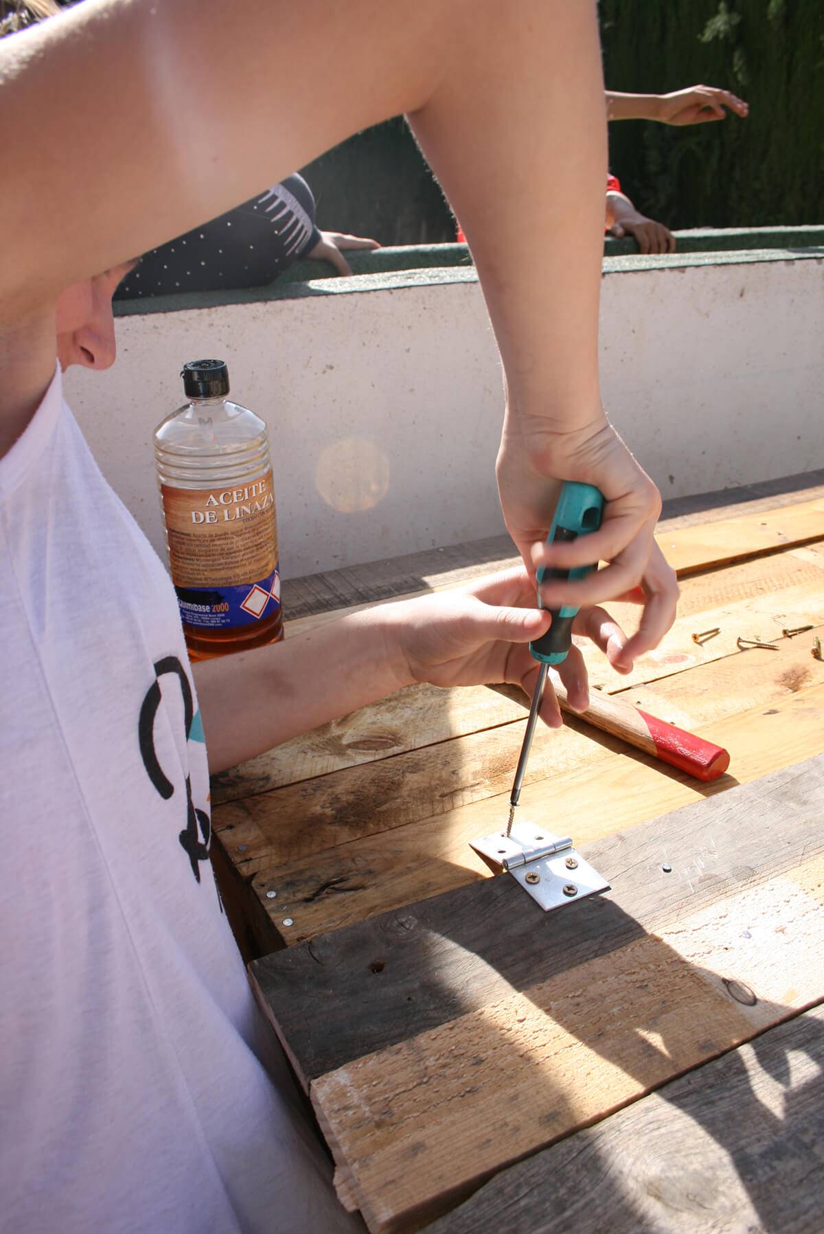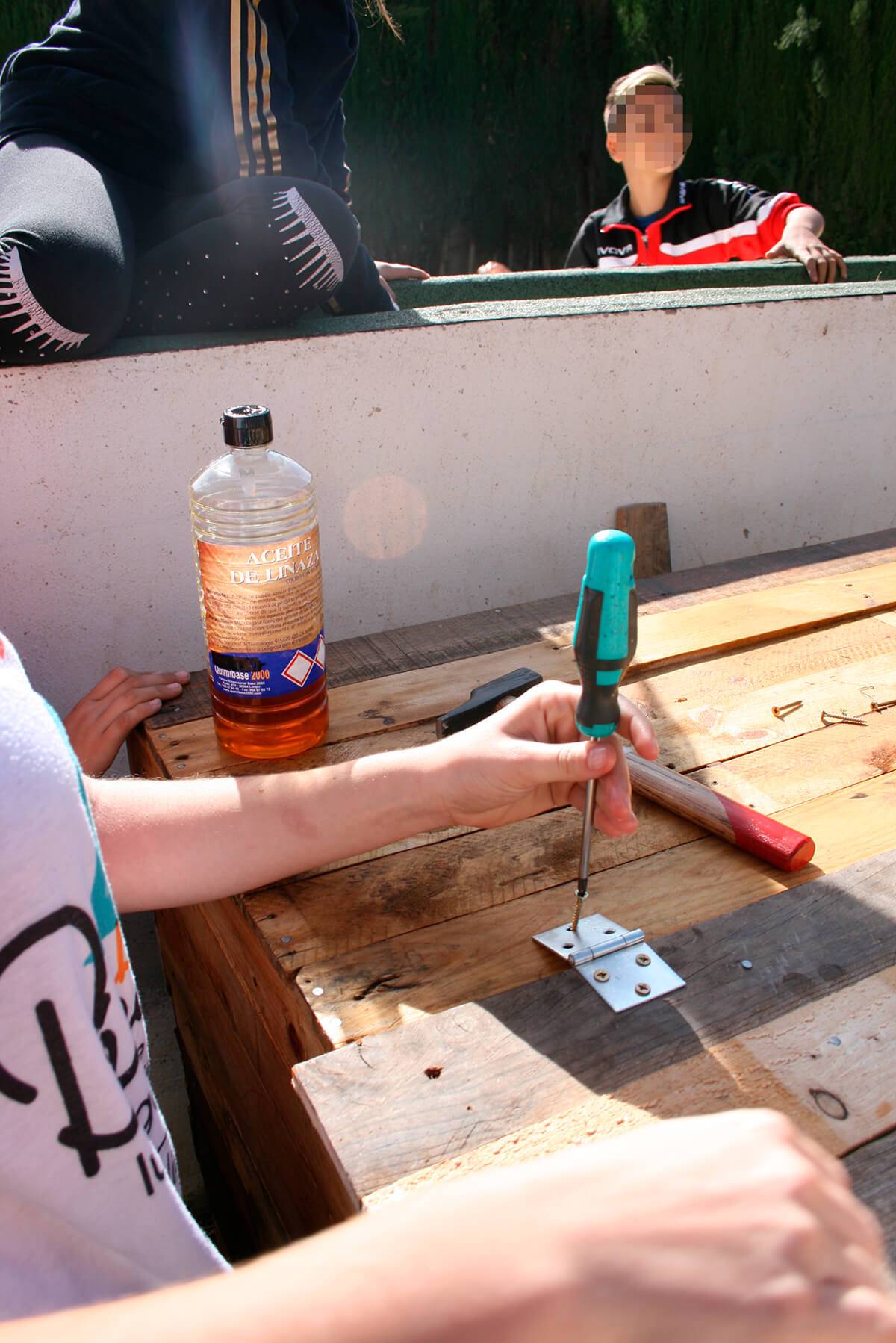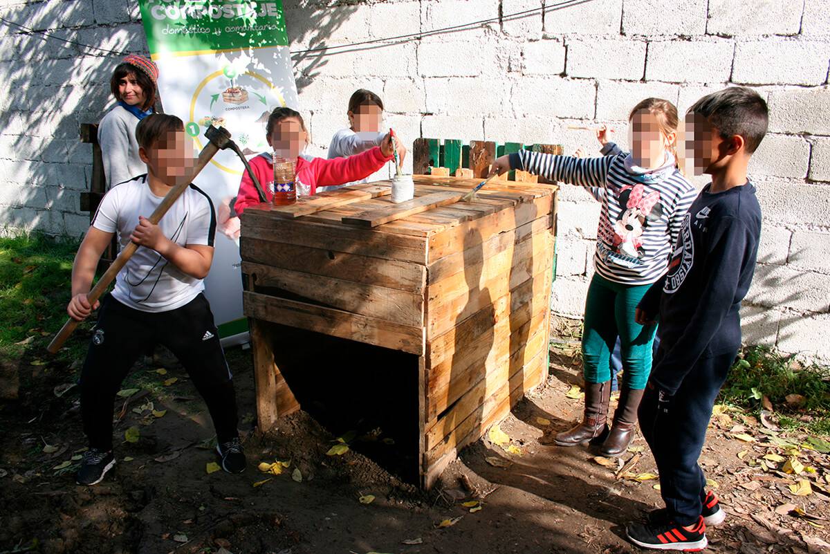 Esta es la segunda actividad más importante del periodo inicial del programa en el centro. En este taller se construye partiendo de materiales reciclados; palés de madera o contenedores desechados, una compostera de aproximadamente 1 m³ para descomponer la materia verde de los residuos de las meriendas de los escolares y restos vegetales de la jardinería de los ajardinados del Centro para obtener compost y nutrir los siguientes ciclos productivos del huerto.