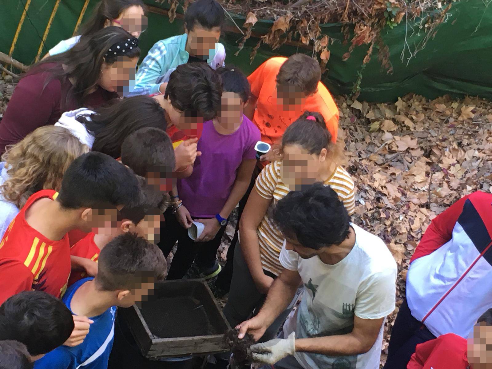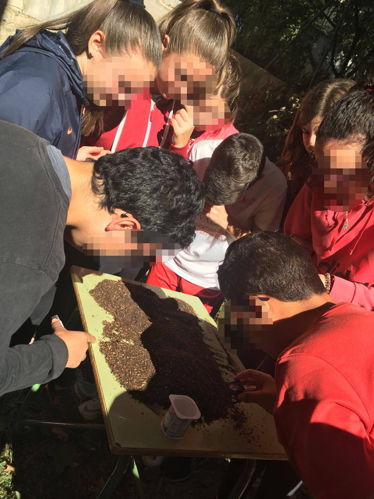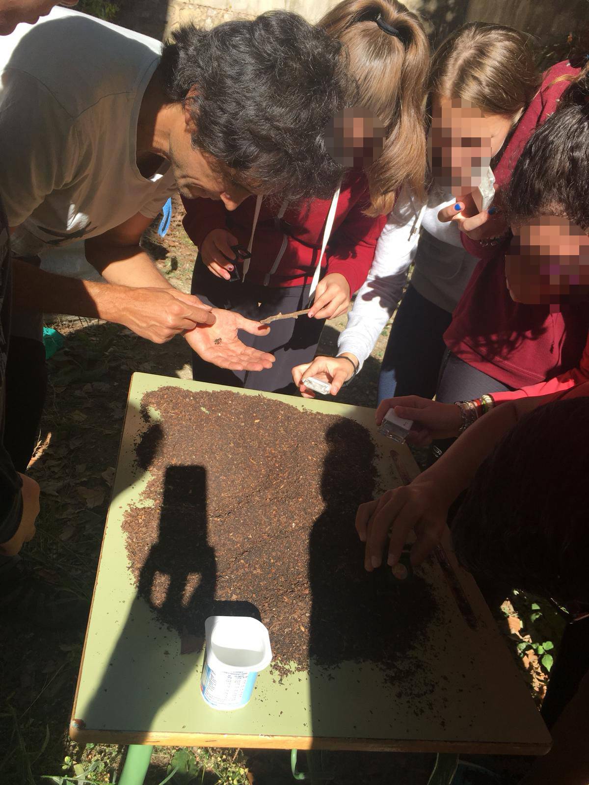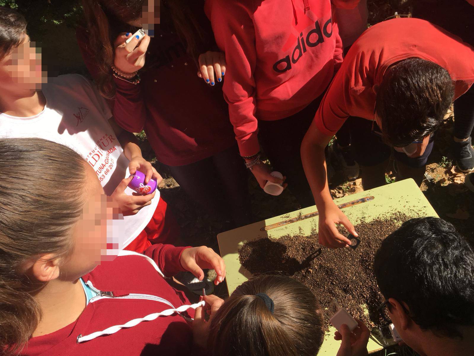 Los escolares han visitado el huerto para hacer una exploración de los habitantes del compost que está generándose en su compostera escolar, y confirmar así que es un sistema vivo. En ella viven organismos de muchos tipos diferentes, algunos visibles a simple vista, y otros a través de lupas o microscopios.